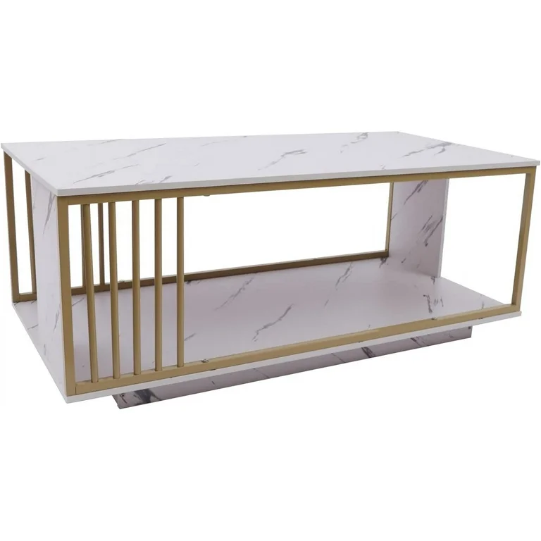 Modern White Marble Veneer Coffee Table, 2 Tier Rectangular Coffee Table with Gold Frame Sofa End Table for Living Room Bedroom