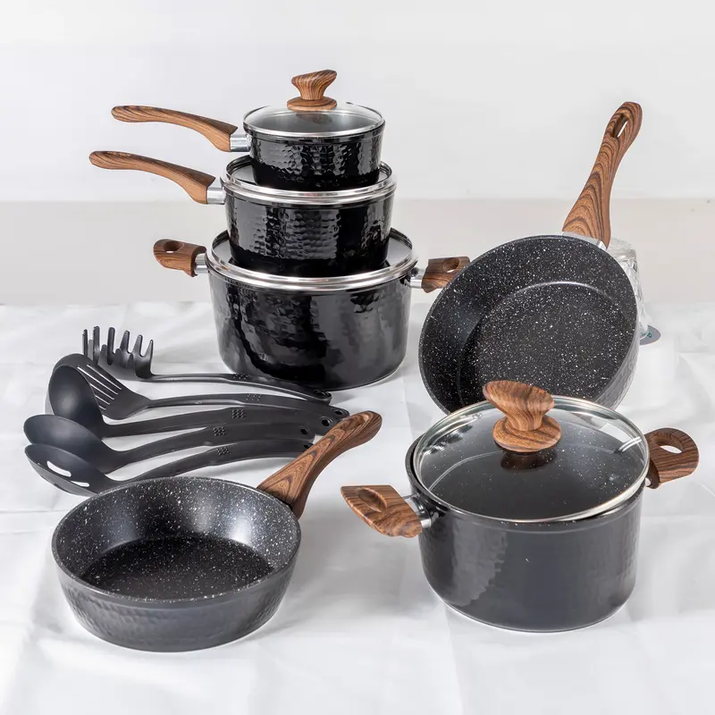 Induction Cookware Sets 15 Pcs Black Hammered Granite Cooking Pots and Pans Set