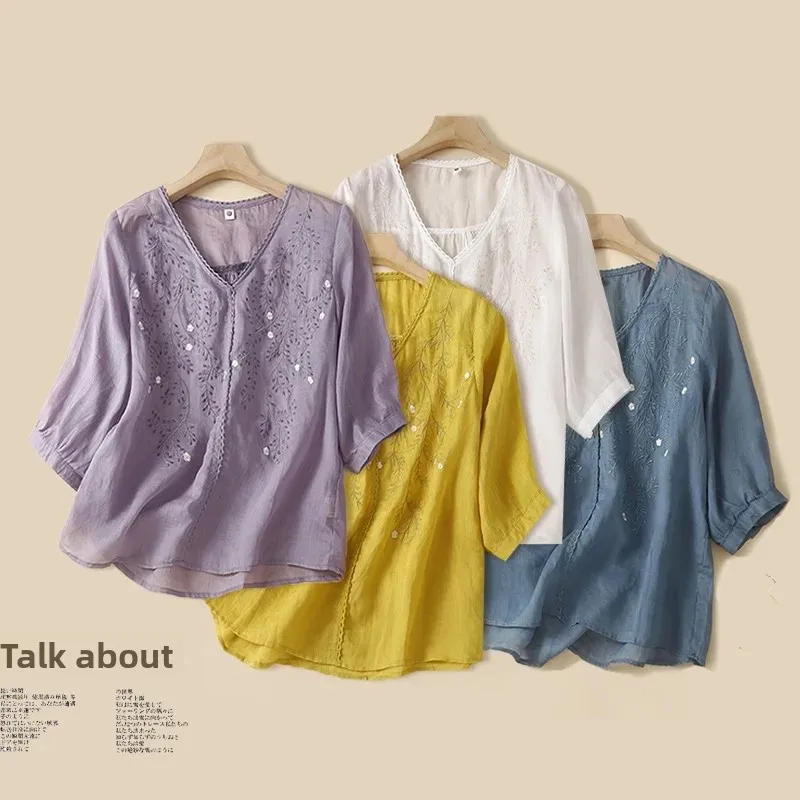 V-Neck Five-Sleeve Embroidered Cotton Linen Shirt Women’s Summer New Thin Loose Beautiful Small Shirt Fashionable Top