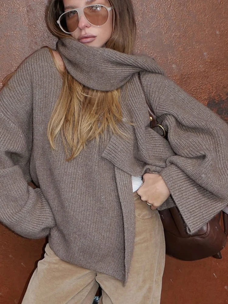 Women’s Irregular Solid Wrap Style Cardigan O-neck Full Sleeve Attached Scarf Oversized Ribbed Knitted Sweater Casual Winter