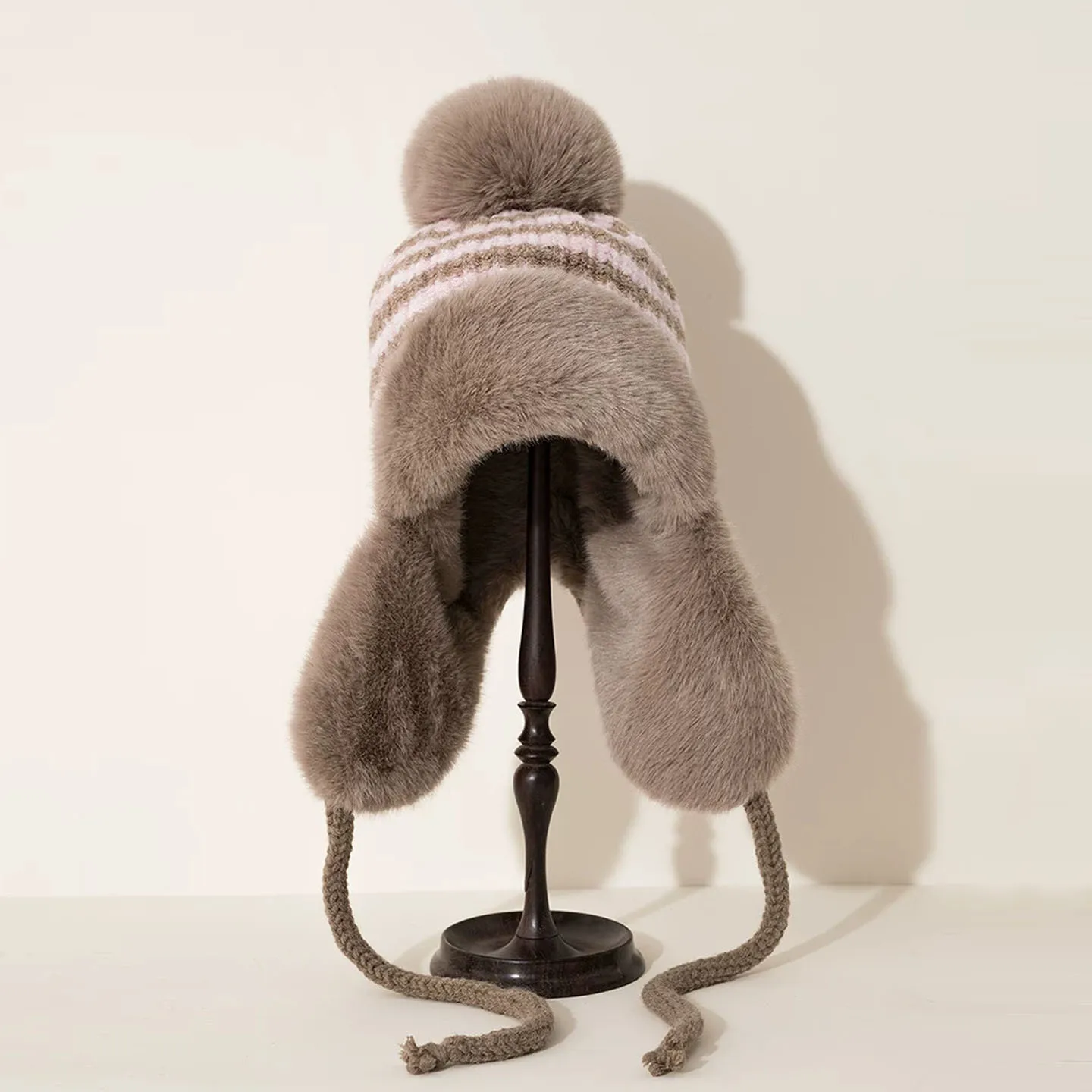 Winter Women‘s Warm Artificial Fur Earflap Hat Sweet Striped Knitted Velvet Riding Windproof Wool Ear-covering Hat for Outdoor