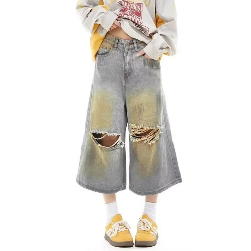 American tide washed ripped jeans shorts for men and women summer new style wide leg loose casual mid length pants cropped pants