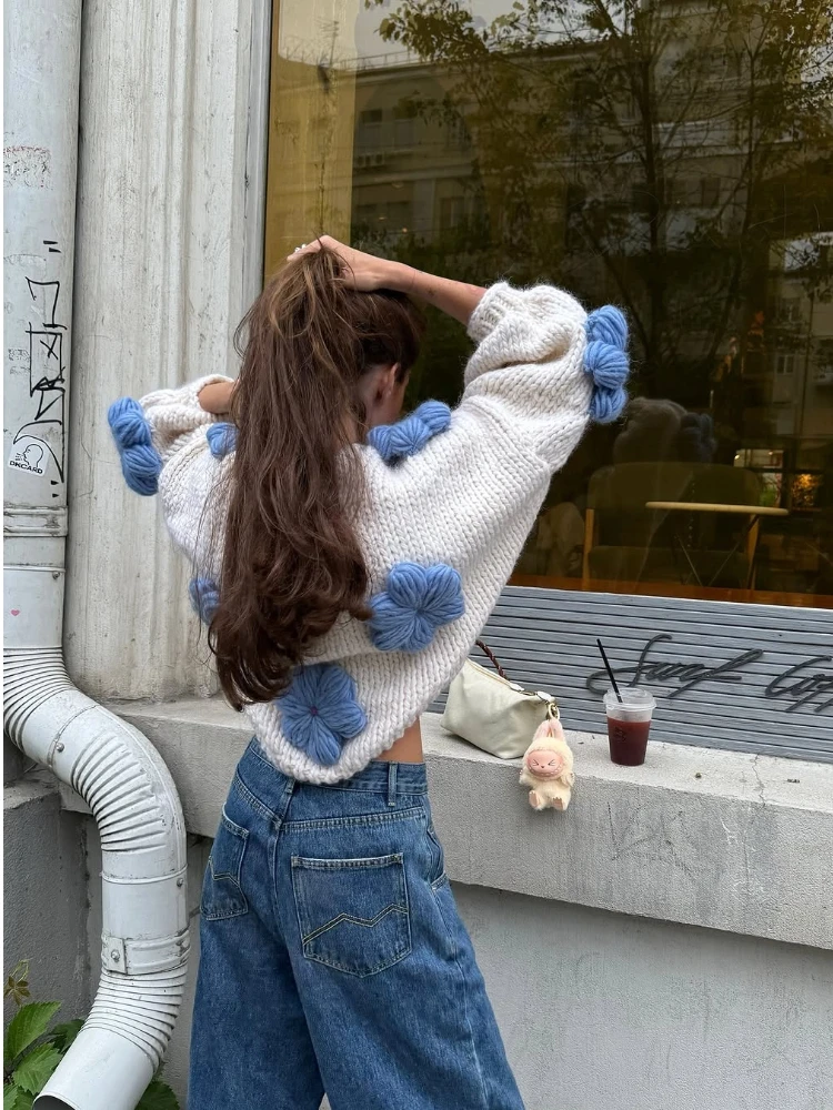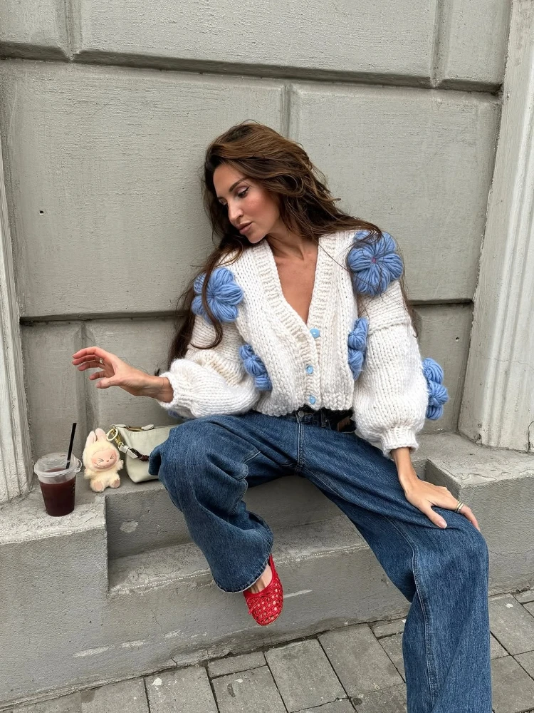 Elegant Knitted Flowers Cardigan Women Retro Chic Loose V-neck Buttons Short Sweaters Female 2025 Autumn Casual Street Knitwear