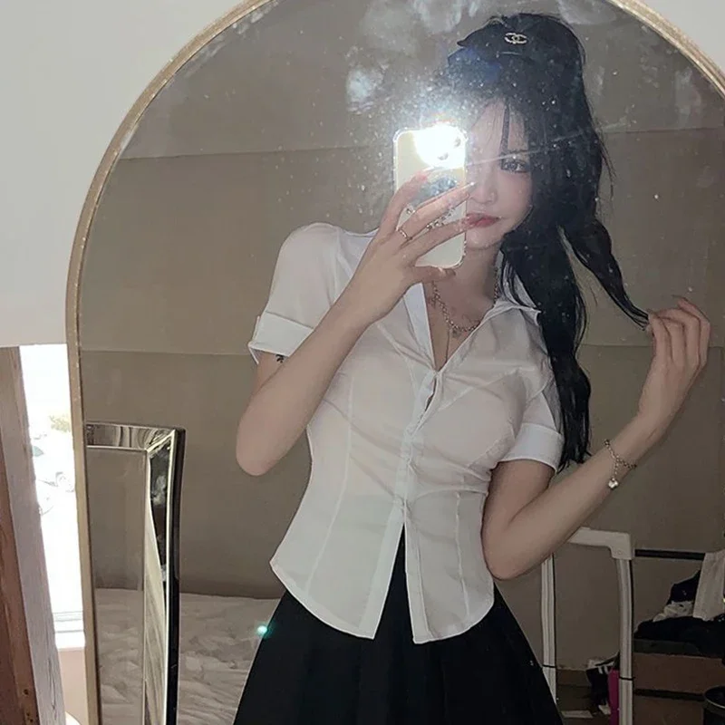 Korean Slim Fit Short Sleeve Cropped Blouse Ladies Solid Color Turndown Collar Shirt Woman Slim Fit Single-breasted Top Women