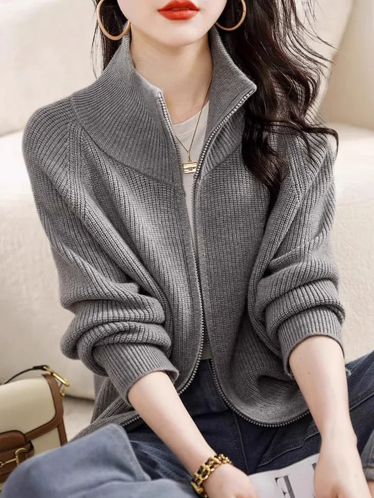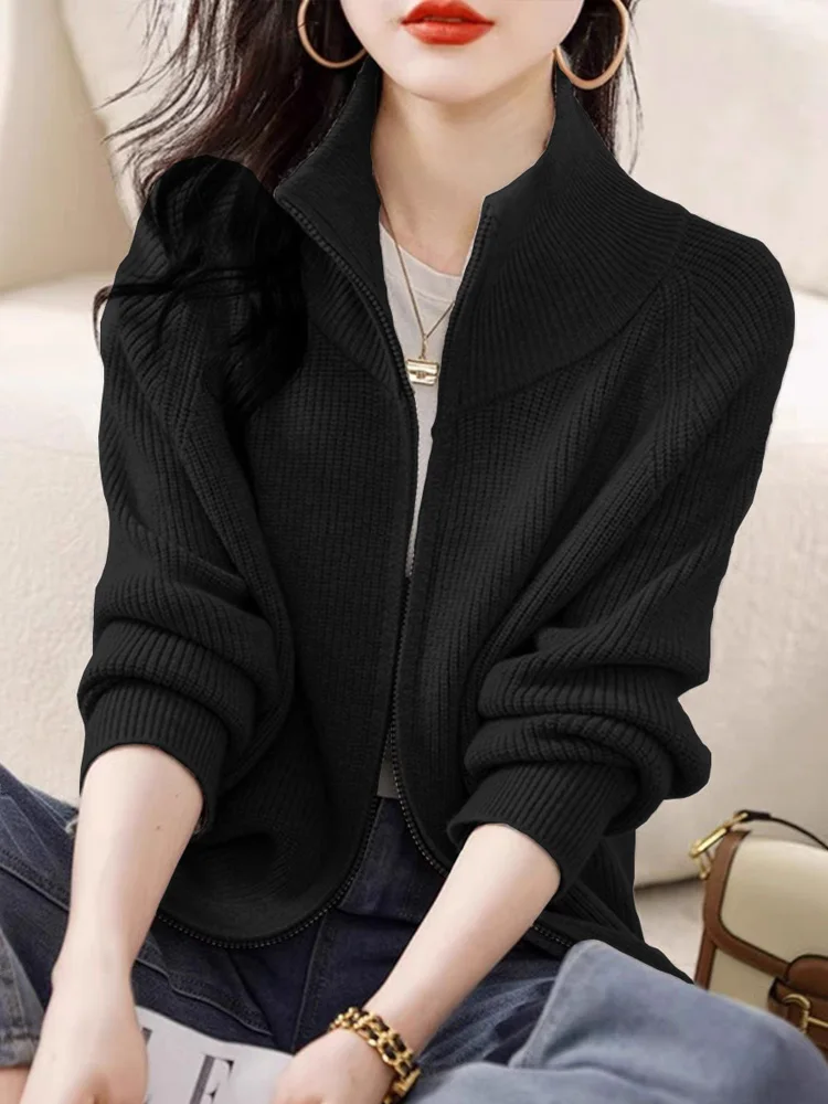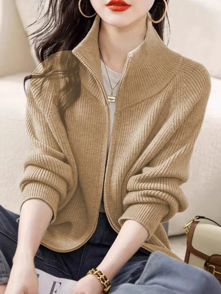 New Fashion Zipper Knitted Cardigan Women Autumn Winter Long Sleeve Sweater Coat Office Lady Casual Slim Knit Tops