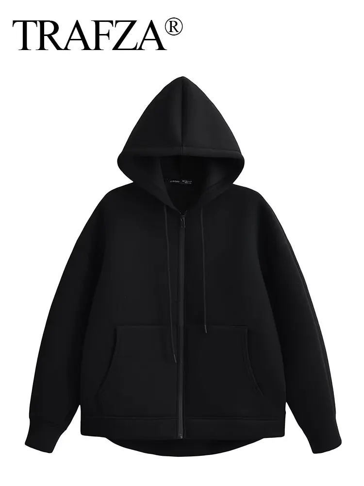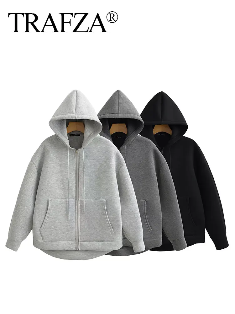 TRAFZA Autumn Women Gray Jacket With Hood Long Sleeve Big Pocket Zipper Jacket Coat Woman Loose Casual Outerwear Coat Tops